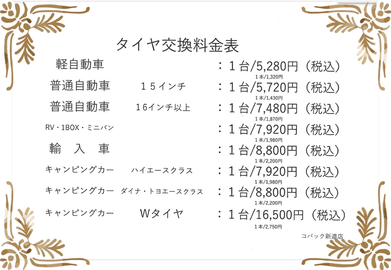 タイヤ交換価格表」 下記料金は令和7年10月1日から適用となります
